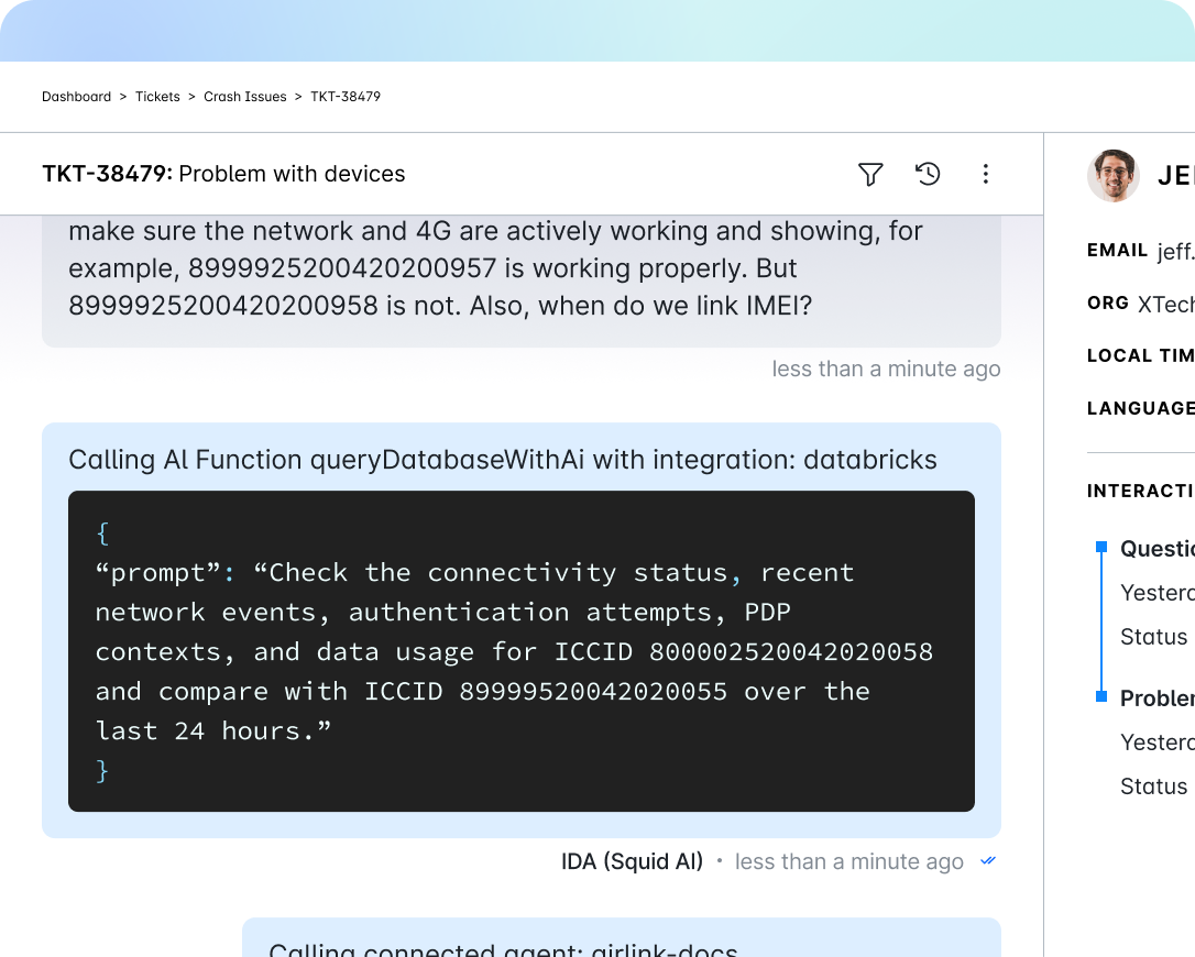 Resolve issues in minutes. IDA connects to your ticketing tools, surfaces the right knowledge instantly, and learns from every case to cut escalations by 50%.